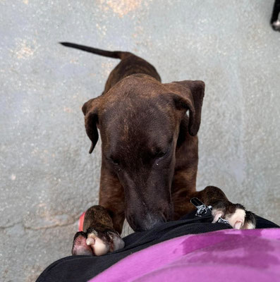 Bis dahin ungesehen, hatte sie Glück und durfte Ende Dezember 2024 auf eine Pflegestelle nach Deutschland reisen. Zunächst war sie auf einer Pflegestelle in Niedersachsen, nun ist sie in der Streuner-WG in Hessen, hat sie sich hier schnell und unkompliziert in das Rudel und Alltagsleben integriert. Alle Gassigänger sind ebenfalls von Angelina begeistert, wenn sie sie auf Spaziergängen mitnehmen.