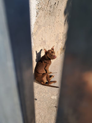 Rasse: Morgina ist derzeit stark abgemagert, wodurch Merkmale schwer erkennbar sind. Eine klare Einschätzung zu Rasse oder möglicher Listeneinstufung ist momentan nicht möglich.
